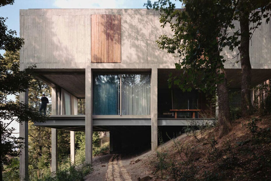 detached concrete house stands on stilts among forest in georgia